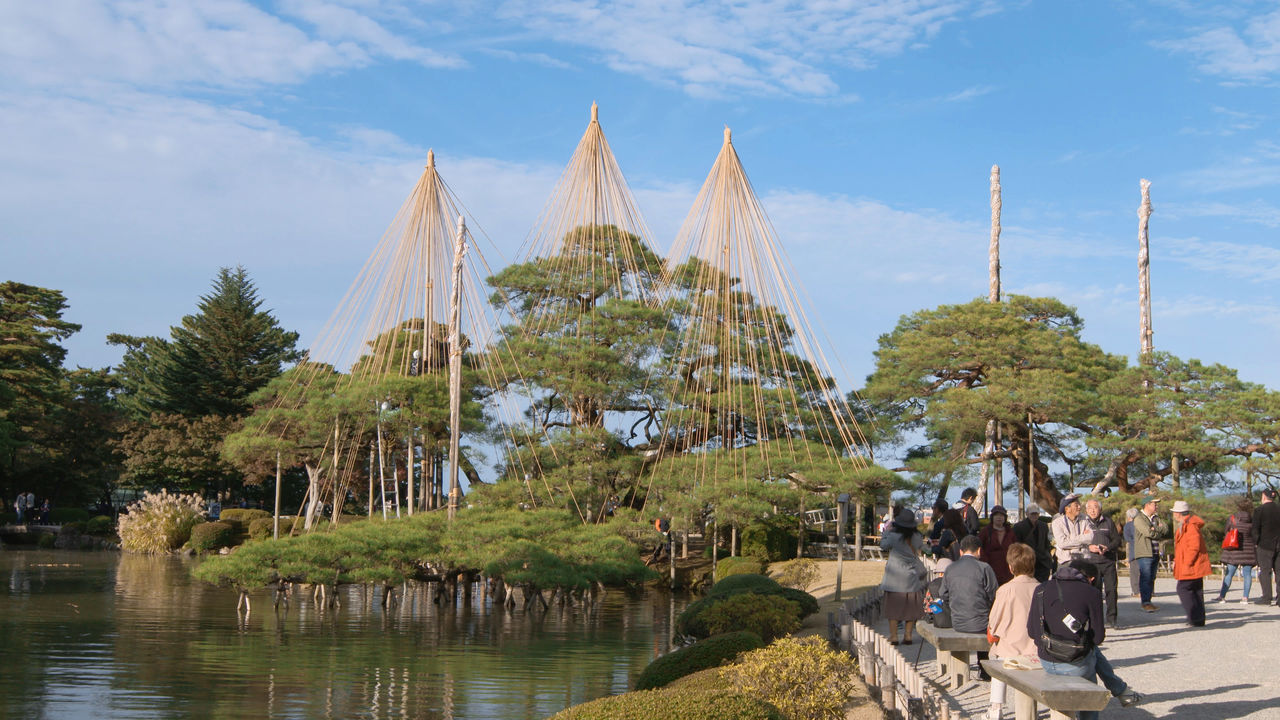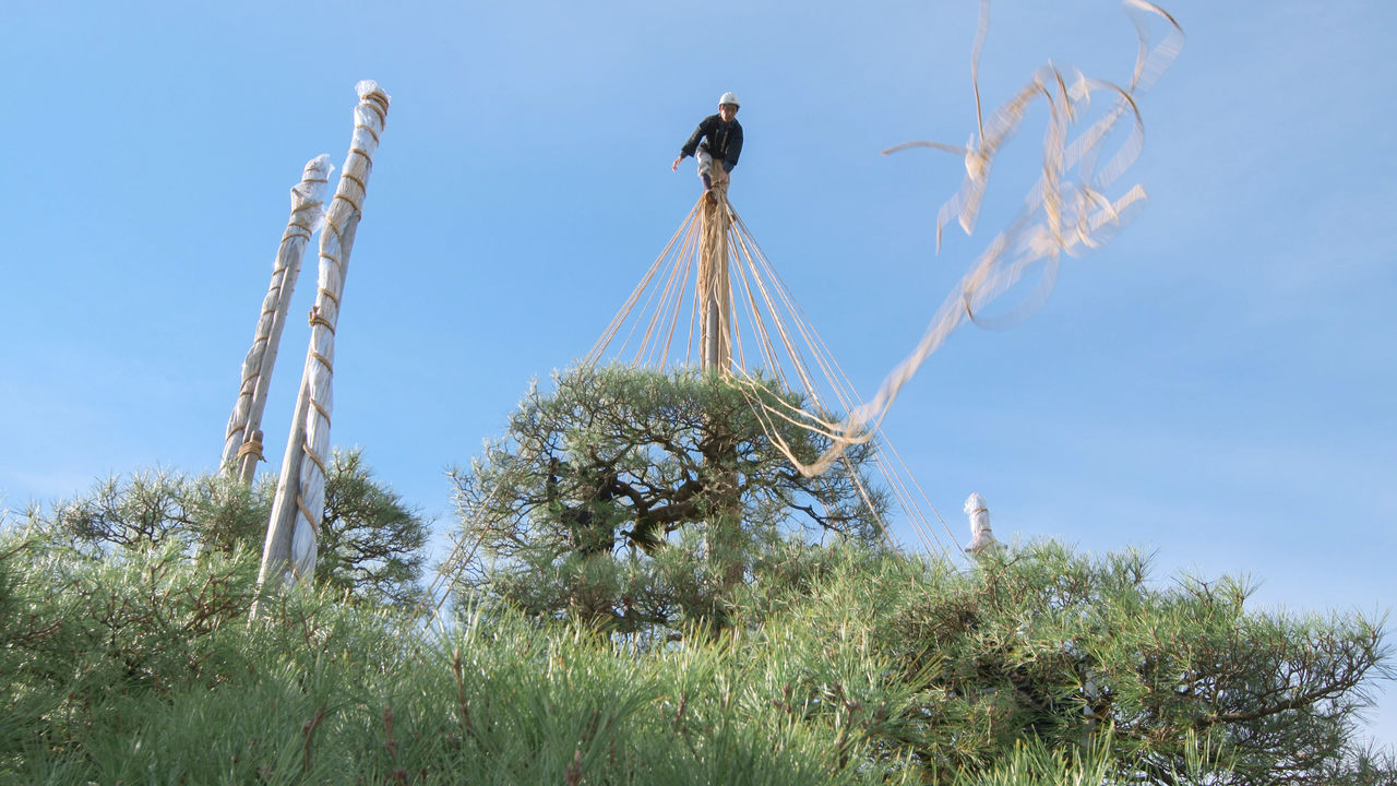 每年11月1日,从堪称拥有国内最为壮观的枝干“唐崎松”的雪吊工作开始,越冬作业拉开序幕。园丁们架起5根支柱,只唐崎松一棵树,就要使用约800根绳子来固定树枝。只见园丁师傅从支柱顶部一根根地抛下绳子,很快,一个美丽的圆锥形就呈现在眼前。这项作业一直持续到12月中旬,雪吊大约在3月前后拆除。
