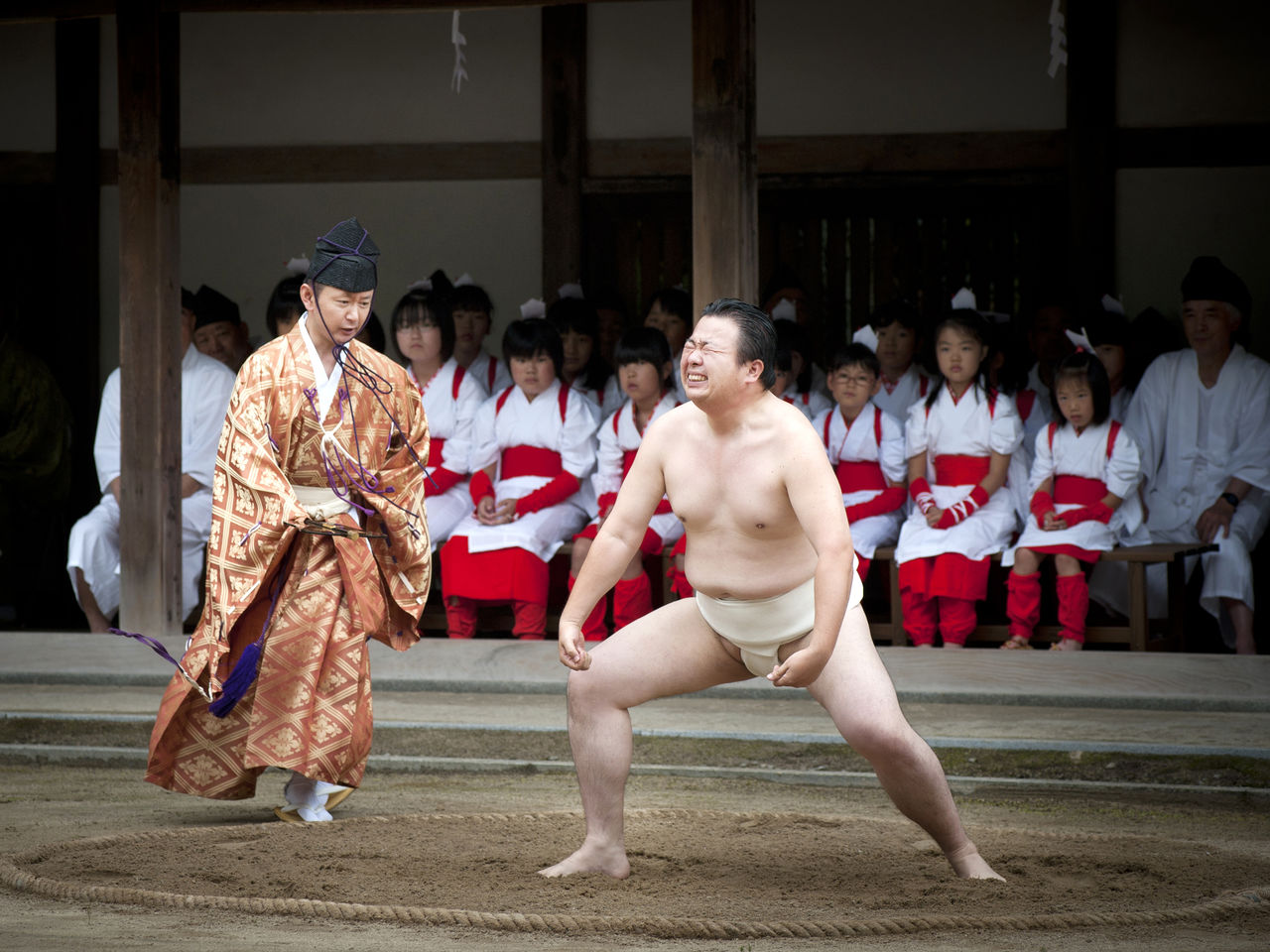 “一人相扑”仪式上,相扑手“一力山”与隐形的“水稻精灵”开展相扑比赛