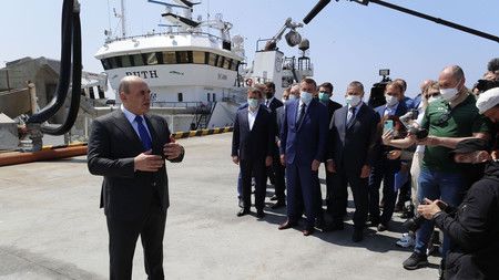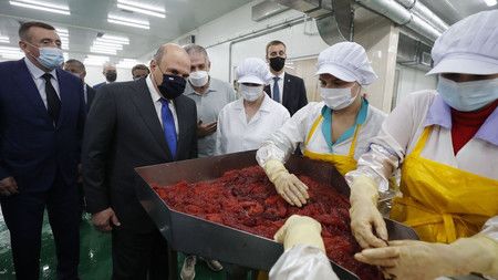 7月26日,俄总理米舒斯京(左二)视察伊土鲁朴岛上的水产加工厂(俄罗斯政府提供)