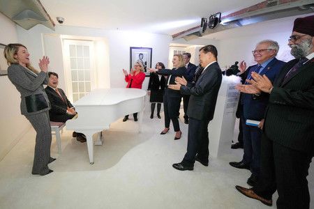 (时事社利物浦)到访英国中部城市利物浦的日本外相林芳正,在七国(G7)外长举行晚宴的“披头士博物馆”,用钢琴演奏了约翰・列侬的名曲《Imagine 想象》,赢来各国外长的一片掌声。