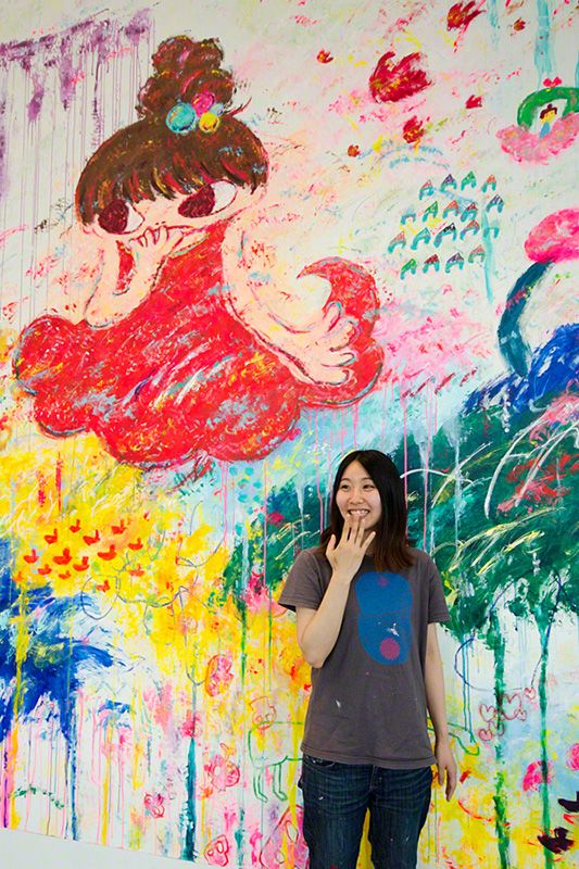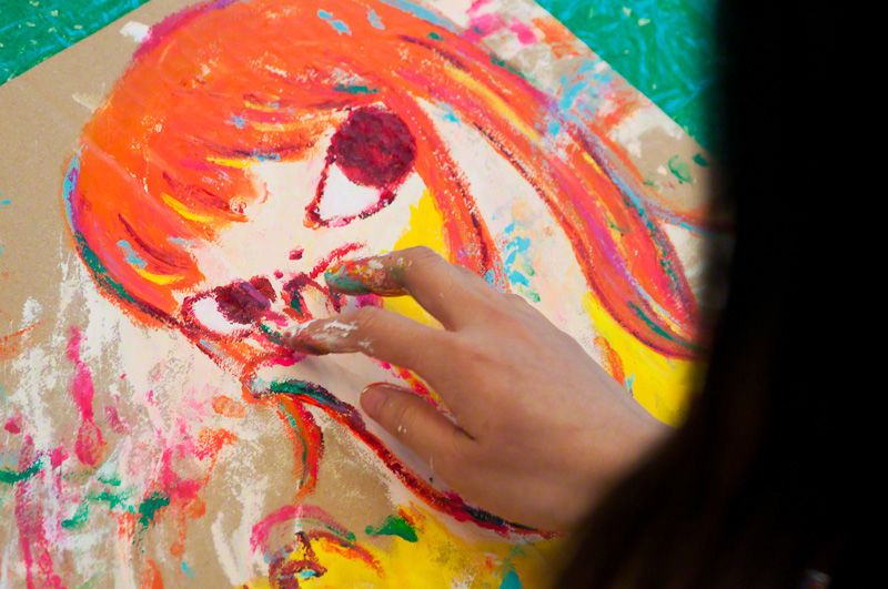 大约10年前,在东京的公园里,出现了一位不使用绘笔、直接用手蘸满丙烯颜料在瓦楞纸上作画的日本姑娘。