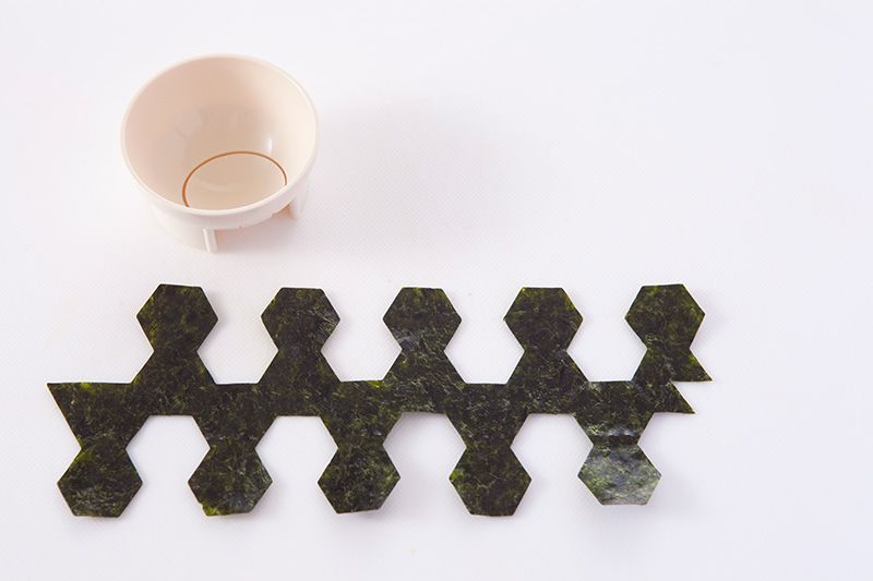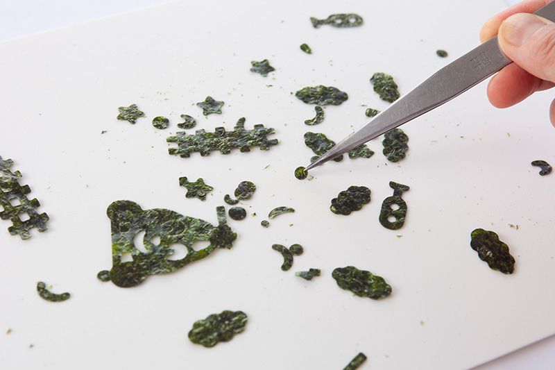 章鱼的眼睛,用的是紫菜做成的铁轨、脸谱等现成图形;你也可以用剪刀将紫菜剪出各种需要的形状,还可以用芝麻代替。