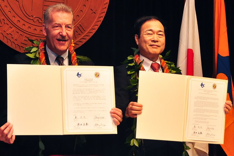 Honolulu’s then Mayor Peter Carlisle (1952–, mayor 2010–13) and Mori sign a sister-city agreement in March 2012. Photo courtesy of Nagaoka City.