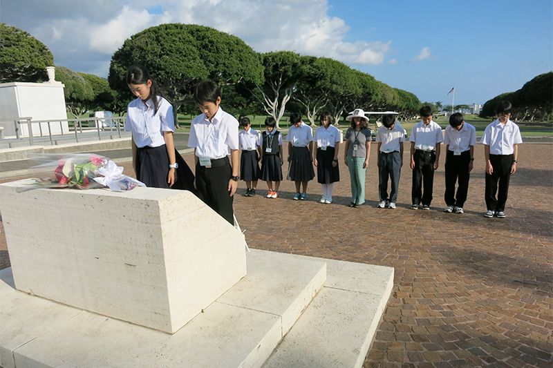 Junior high school students from Nagaoka lay a wreath at Honolulu’s National Memorial Cemetery of the Pacific (Punchbowl Cemetery) in January 2015. Photo courtesy of Nagaoka City.