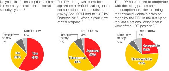 (3) The LDP stance of refusing to cooperate with the ruling parties to raise the consumption tax, on the grounds that this would violated the promises made by the Democratic Party of Japan in its election manifesto, was found unacceptable by 61% of those surveyed, and supported by just 24%.