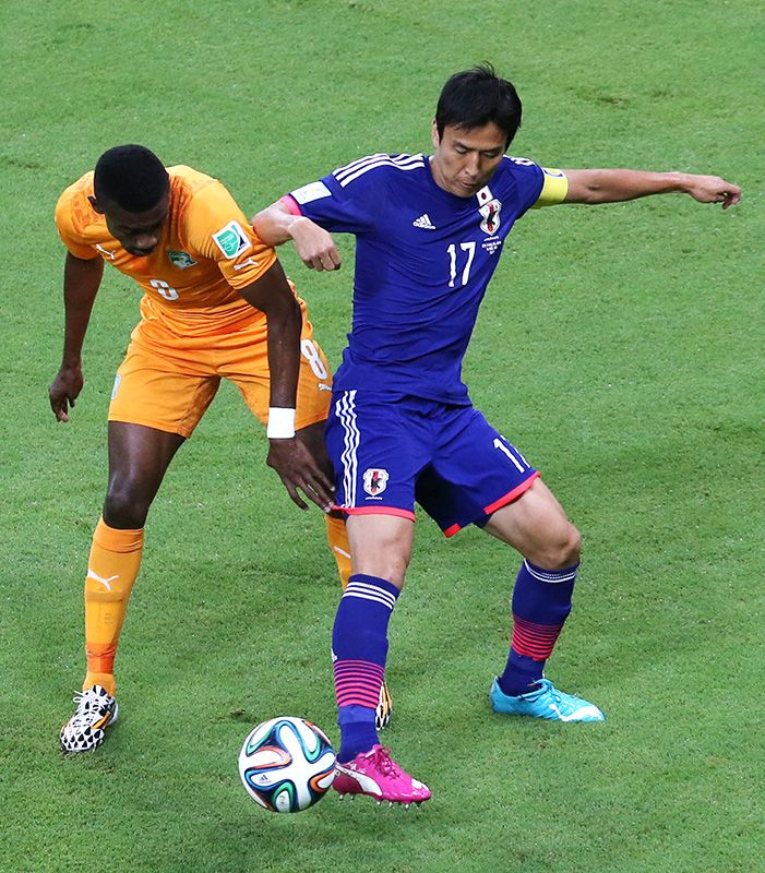 Despite these ambitions going into the World Cup, on June 14 the Japanese team went down in a 2–1 defeat to les Éléphants of Côte d’Ivoire. Japan scored first, 16 minutes into the game, when Honda neatly trapped an assist from Nagatomo and drove it home with a powerful left-footed strike. But this would be the team’s only bright moment. Throughout the game Samurai Blue played timidly in the face of their African opponents, and when Drogba finally came on 15 minutes into the second half, the Japanese players appeared to fear the Ivorian hero to such a degree that they failed to mark the other threats on the field.