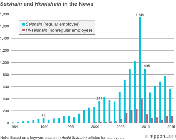 The word hi-seishain, by contrast, almost never appears in articles until the mid-1990s. Even as recently as 2004, there were only 24 stories, or two per month on average.