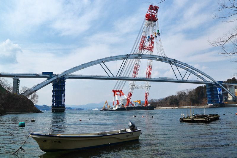 A massive crane barge sets the span down on its pillars. The main structure was built in Okayama Prefecture and shipped to Miyagi for installation.