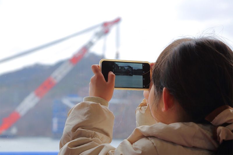 A young schoolgirl from the island photographs the new bridge pillars during a tour of the site for Ōshima residents. Her worried question to her father, “Is the ferry really going to disappear?” hints at the uncertainties that remain in the islanders’ future.
