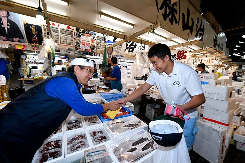 A market wholesaler (left) shakes hands with a seafood purchaser on the last day of operations at Tsukiji. (© Jiji; pool photo)