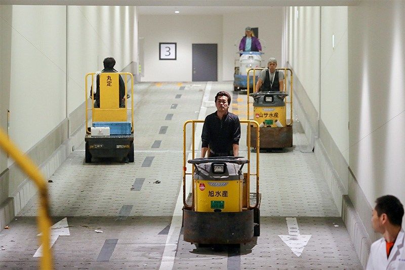Market workers drive the famed “turret trucks” from the Tsukiji market to the new location in Toyosu in the predawn hours of October 7, 2018. (© Jiji)