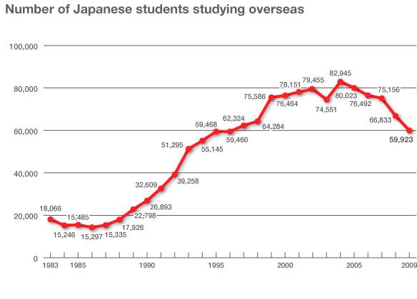 Statistics from the Organisation for Economic Cooperation and Development and other sources reveal that the number of Japanese students studying overseas peaked at 82,945 in 2004 and declined thereafter, falling to 59,923 in 2009. Japan has been surpassed in this respect by both China, which has over 500,000 students studying abroad, and South Korea, with over 100,000. Based on these numbers alone, it could be said that young people in Japan are more “inward looking” than those in other countries.