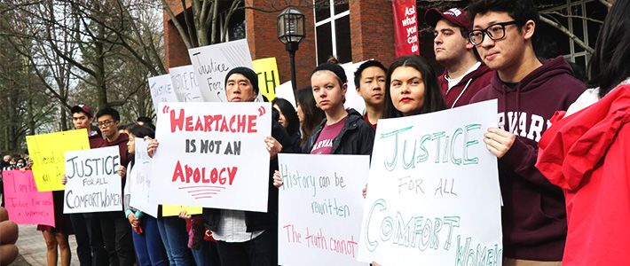 (Banner photo: Protesters hold signs urging Prime Minister Abe to apologize for Japanese war crimes as he visits Harvard University on April 27, 2015. © Xinhua/Aflo. The author thanks Anne Cheng for comments on an earlier version of this essay.)