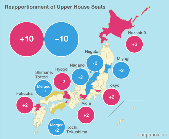 Up to now, each of Japan’s 47 prefectures has been a regional electoral constituency for the House of Councillors. But under the revised law, two pairs of prefectures were merged: Shimane and Tottori in western Honshū became a single regional district, and so did Kōchi and Tokushima on the island of Shikoku. (These are the four least populous prefectures; the mergers were part of a reapportionment plan to reduce the vote disparity among the upper house constituencies.)