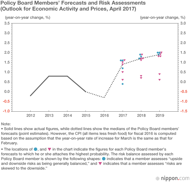 In the April Outlook for Economic Activity and Prices, the BOJ states, “The timing of the year-on-year rate of change in the CPI reaching around 2 percent will likely be around the middle of the projection period—that is, around fiscal 2018. Thereafter, the rate of change is expected to remain at around 2 percent.” The inflation forecasts of Policy Board members are also on the high side, with the median being 1.7% for fiscal 2018 and 1.9% for fiscal 2019.