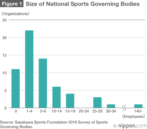 Japanese amateur sports governing bodies are generally small and poorly funded. A 2016 survey of 62 authorities conducted by the Sasakawa Sports Foundation found that 75% of them were minimal operations with 10 or fewer employees. Among these, 11 organizations had no regular employees, 22 had up to 5, and 14 had up to 10.