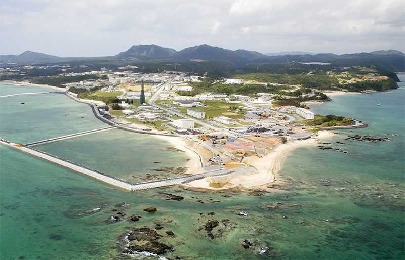 A view of the Henoko coastal area in Nago (already home to Camp Schwab), where the Marine Corps Air Station Futenma is scheduled to be relocated. Landfill work was halted in late August 2018, after the prefecture revoked its permit. (© Jiji)