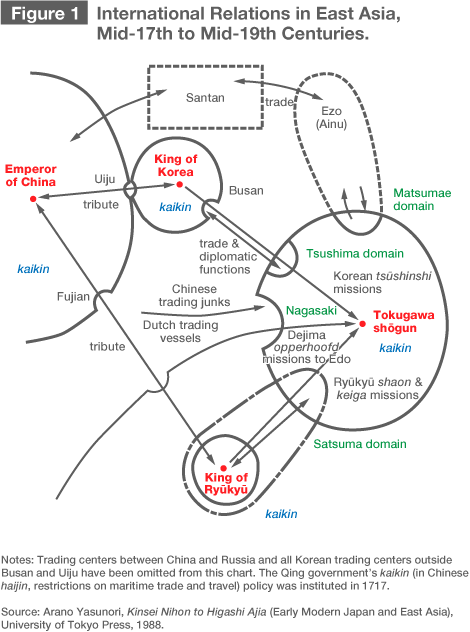 Be that as it may, at the end of the seventeenth century, the rulers of Japan, Korea, China, and Ryūkyū all enforced kaikin policies that banned or strictly controlled the private movement of people and goods in and out of the country, while simultaneously building a network of official ties—in essence, international relations. Through the exchange of diplomatic missions, trade in goods, agreements regarding the return of shipwrecked mariners, and other understandings, this system functioned effectively to avert serious conflicts between states, as indicated by the long peace that persisted in East Asia until the second half of the nineteenth century.