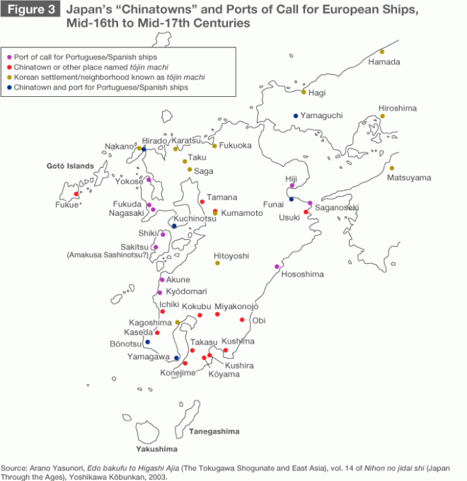 Meanwhile, merchants of Chinese origin had been settling in Japan to trade for silver in defiance of the Ming government's prohibition. This led to the growth of numerous Chinese settlements and neighborhoods known as tōjin machi (Chinatowns), particularly in Kyūshū (figure 3). Indeed, the immigration of Chinese merchants was a driving force behind the development of Nagasaki itself, even though the immediate impetus was the opening of the port to Portuguese ships in 1571.