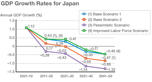 - Base Scenario 1: Japan’s productivity growth rate recovers to the developed countries average of 1.2% (corresponding to a 0.8% growth rate for gross domestic product).