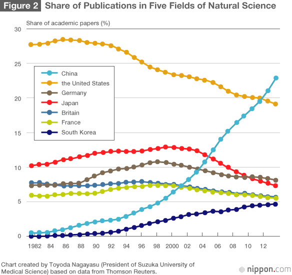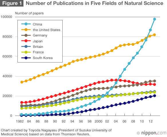 Maskawa Toshihide, winner of the 2008 Nobel Prize in Physics, was quoted as saying that, “since nine or ten people win the Nobel Prize every year, it is natural to expect that at least one would be from Japan.” But the expectation expressed in that theory is based on the global share of publications that Japan has had. That is to say, up until around 2001, Japan was in the envious position of having a 10% to 13% share of the world’s academic papers, ranking second.