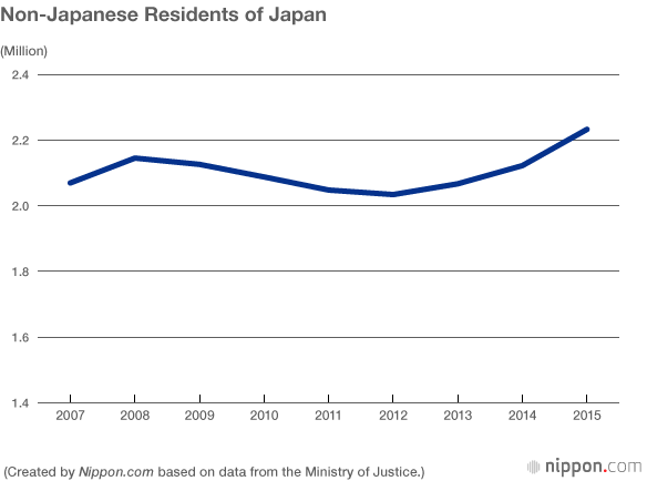 According to Ministry of Justice figures, there were over 2.23 million non-Japanese residents in Japan in 2015, an increase of 5.2% from the previous year and the largest tally since the ministry began keeping records in 1959.