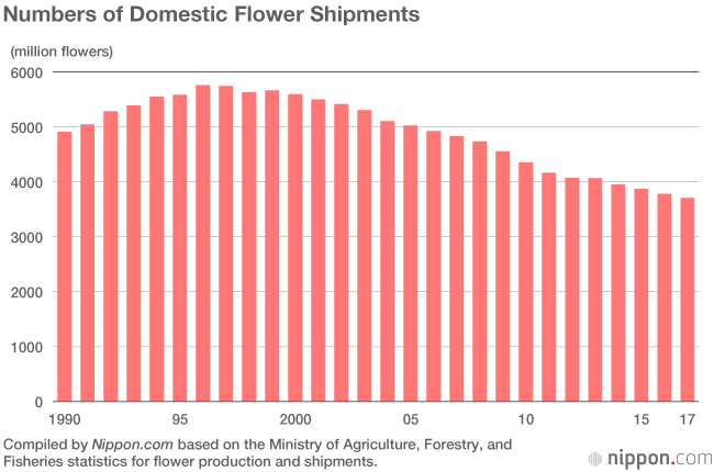 Since 2000, the volume of domestic cut flowers has been in a downward trend. In 2017, 3.7 billion flowers were shipped, the lowest amount since statistics were first collected in 1990. The main causes are thought to be the aging of growers, typhoon damage, and a steep rise in fuel prices leading to decreased use of greenhouses for cultivation.