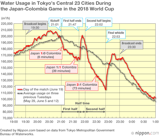 When Japan had the chance for a historic victory against Colombia in its first game of the 2018 World Cup, fans across the country did not want to miss a moment. The patterns of water usage during the match offer eloquent testimony to the depths of their interest.