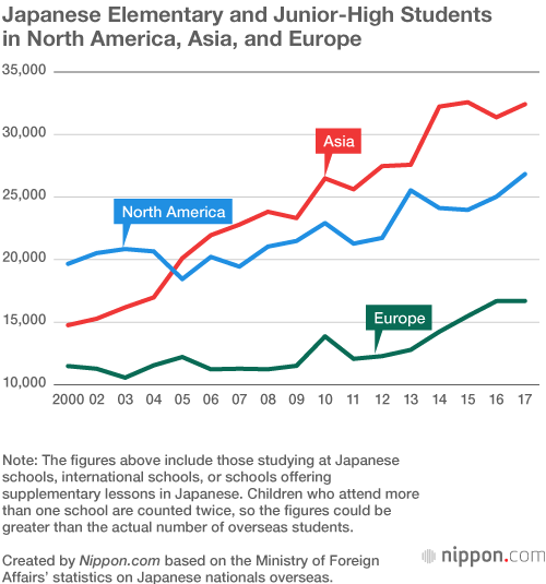 Japanese overseas students in Asia at the elementary- and junior-high school levels numbered 32,425 in 2017, an increase of more than 40% compared to the 22,801 in 2007. The expansion of Japanese companies into the region and the economic development of Asian countries, particularly China, whose level of trade with Japan has been higher than the level of US-Japan trade since 2004, have brought in more Japanese families. The number of Japanese students in Europe and the Americas is also rising, while the number in the Middle East, Africa, and Oceania has not changed significantly.