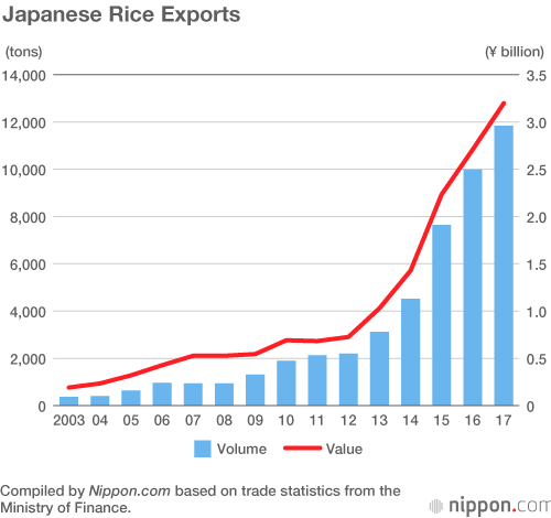 The government has set goals to expand exports of Japanese agriculture, forestry and fishery products, and food to ¥1 trillion by 2019 (¥807.1 billion worth was exported in 2017), but rice and rice processed products are unlikely to account for any more than ¥60 billion of that amount. Furthermore, the set target value for polished rice is a modest ¥3 billion, while processed rice products (including rice crackers and sake) make up ¥57 billion of the total amount of exported rice.