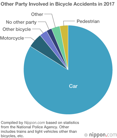According to the National Police Agency, traffic accidents involving bicycles rose by 430 cases from the previous year to 90,407 in 2017. A breakdown of the figures shows that overwhelmingly accidents were caused by cars, with 76,036 cases recorded. However, the number of accidents where pedestrians were injured by bicycles rose by 269 cases to 2,550.