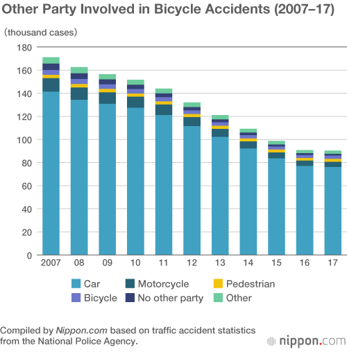 The total number of traffic accidents in 2017 was 472,165 cases, a huge drop from 2004, when accidents peaked at 952,720. A total of 3,694 fatalities occurred, the lowest number recorded since the National Police Agency began collecting data 48 years ago. In the 10 years from 2007, accidents involving bicycles have also greatly fallen. Of total traffic accidents though, the proportion of bicycle-related accidents remains around 20%.