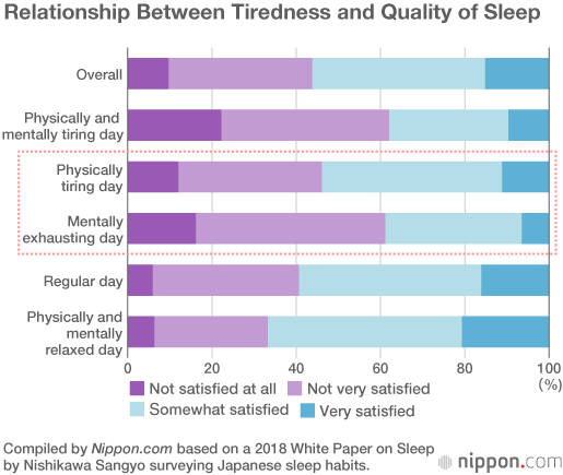 “Even if I switch the light out and lie on the futon, I can’t sleep". “I suddenly get extremely tired while at work, probably because I can’t sleep at night.” A surprisingly large number of people have concerns about sleep. The recent results of a survey conducted by the bedding manufacturer Nishikawa Sangyō reveal that half of the Japanese population may be suffering from insomnia.