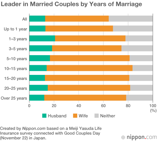 According to a survey by Meiji Yasuda Life Insurance, the wife is the leader in the majority (51.6%) of married couples in Japan. In contrast, husbands hold that role in just 12.8% of marriages. The survey also found that the wife rules the roost regardless of how long the couple have been married—it held true for newly wedded couples married for less than a year through to long-time married couples married for over 25 years.