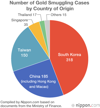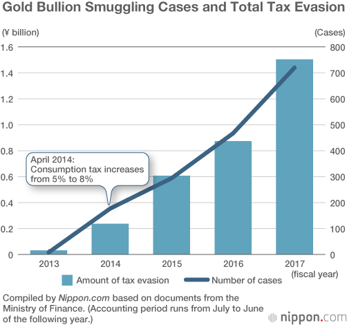 Gold smuggling is increasingly common in Japan. Criminal cases related to avoidance of import duties and consumption tax rose by almost 50% in the accounting year from July 2017 to June 2018, to 720. In the same period, the total amount of tax evasion hit a new record high, with a 70% increase to ¥1.54 billion.