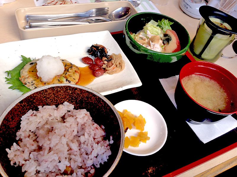 Lunch set with tofu hamburger, zakkoku (mixed grains) rice, chicken salad, miso soup, pickles, and genmaicha (brown rice tea) with added matcha (green powdered tea).