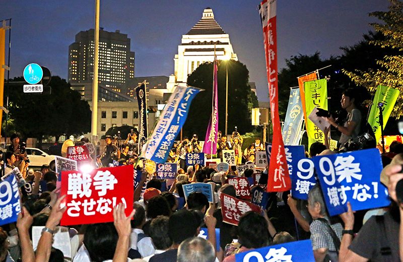 Demonstrators protests against security legislation outside the Diet in Nagatachō, Tokyo, on July 16, 2015. (© Jiji)