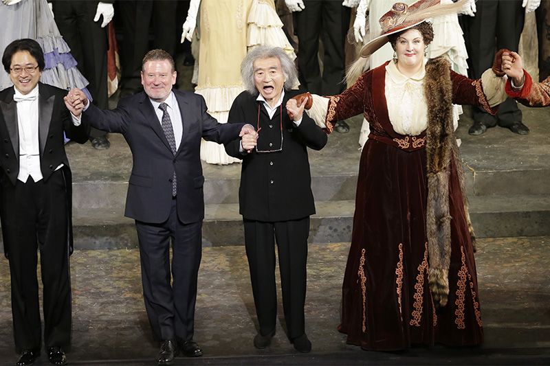 Ozawa Seiji (second from right) smiles at a curtain call after conducting Die Fledermaus—the first opera he has conducted following his Grammy win—in Kyoto on February 18, 2016. (© Jiji)