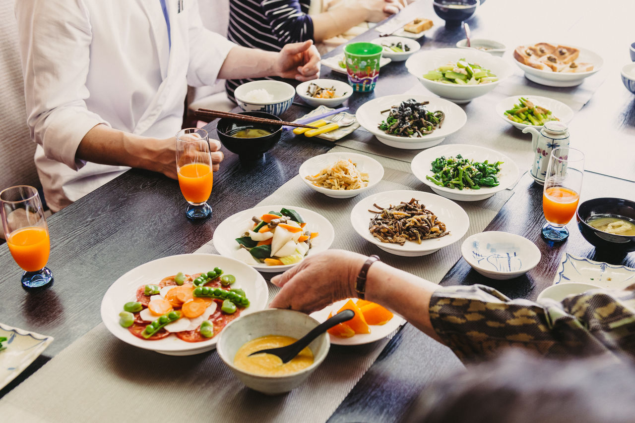 The Satō family’s breakfast table displays a wide array of healthful, enticing dishes featuring local vegetables and edible plants.