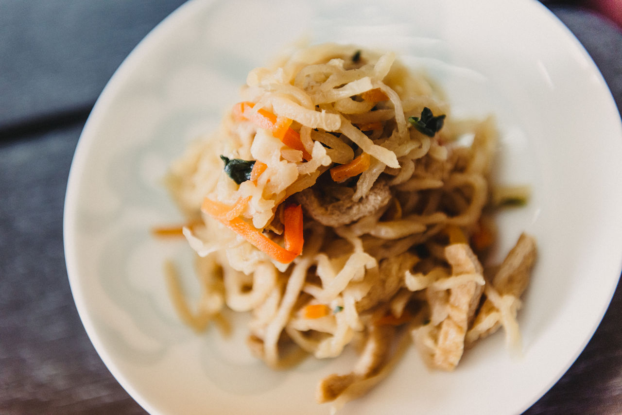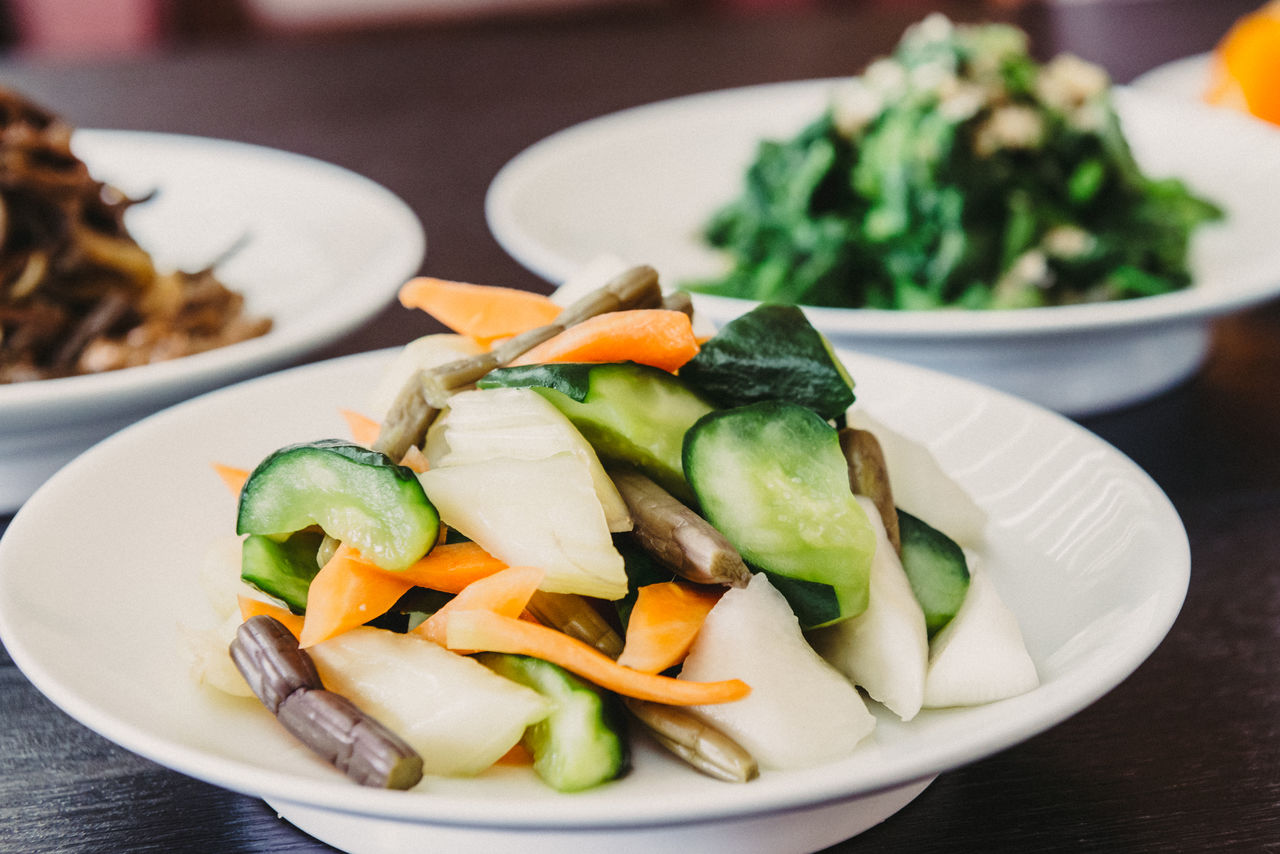 Pickled warabi (bracken fiddleheads), cucumber, celery, and snow carrots