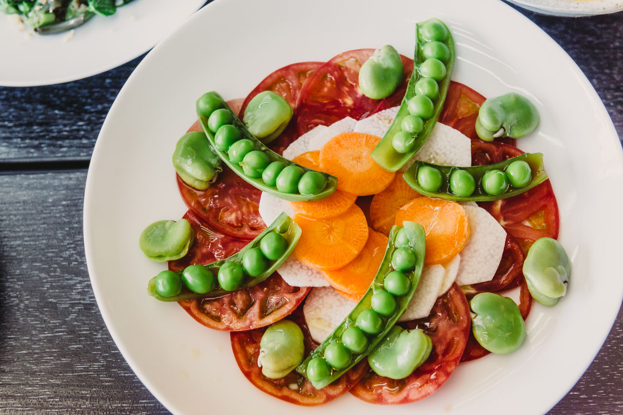 A modern salad consisting of tomatoes, nagaimo (Chinese yam), snow carrots, snap peas, and broad beans