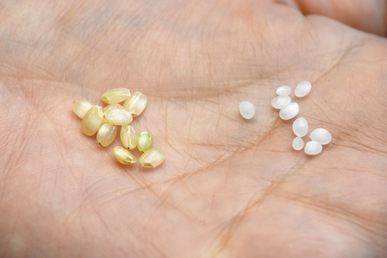 The rice used to make daiginjō (super-premium ginjō) is polished until only a fraction of its original weight remains. Dewasansan (a premium rice strain from Yamagata Prefecture used to make a popular ginjō of the same name) is shown in its unpolished form (left) and after being milled to a seimai buai of 50%