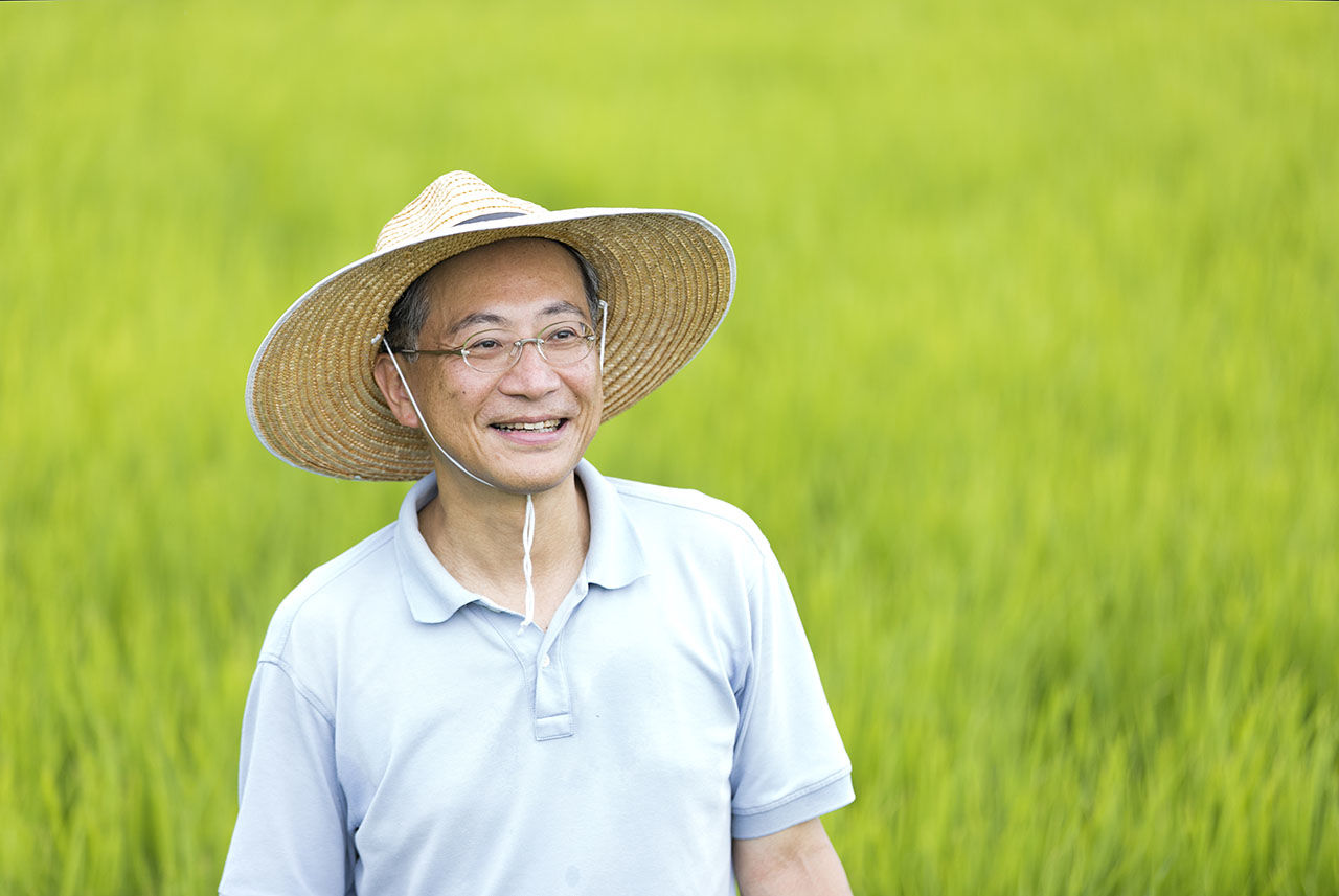 Aoshima Takashi can be found out in his agrochemical-free Yamadanishiki rice paddy.