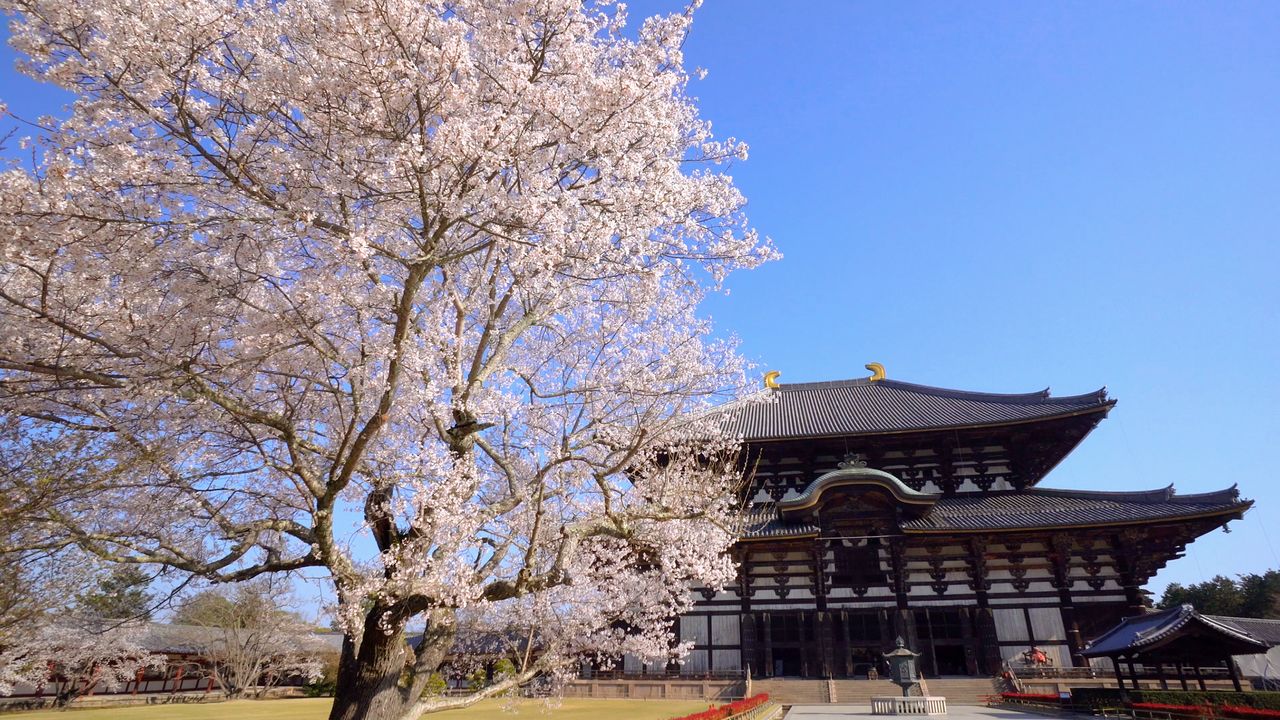 The main hall of Tōdaiji, which houses the Great Buddha statue of Nara, sets off the surrounding cherry trees.