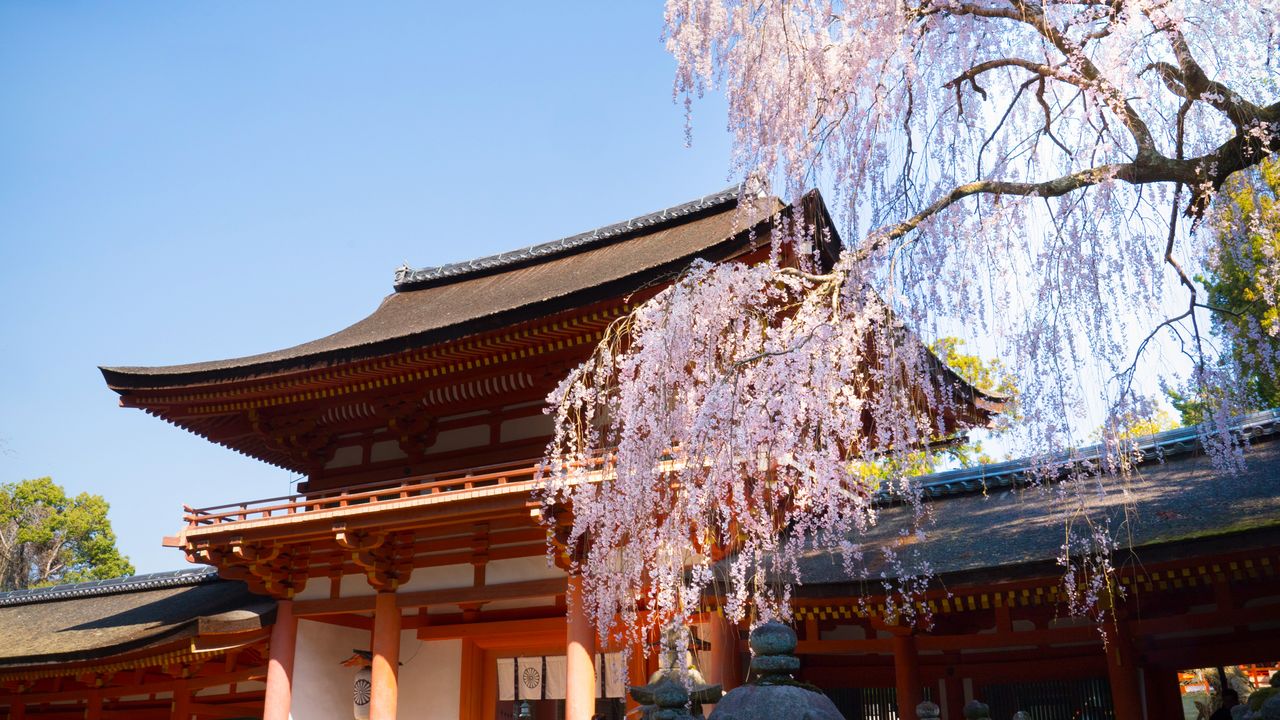 Weeping cherry trees bloom near the crimson Sanmon gate of Kasuga Shrine.