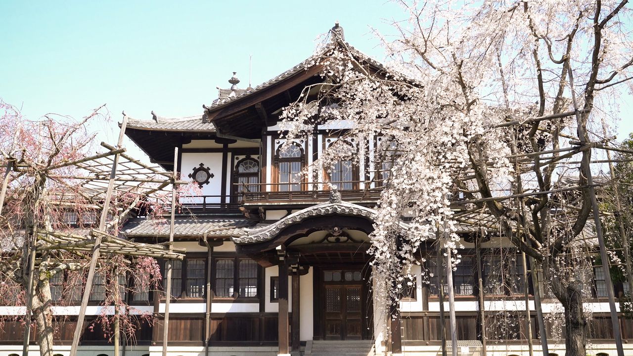 The Nara National Museum Buddhist Art Research Center, an example of modern Japanese architecture and a nationally designated important cultural asset, elegantly draped with blossoms.