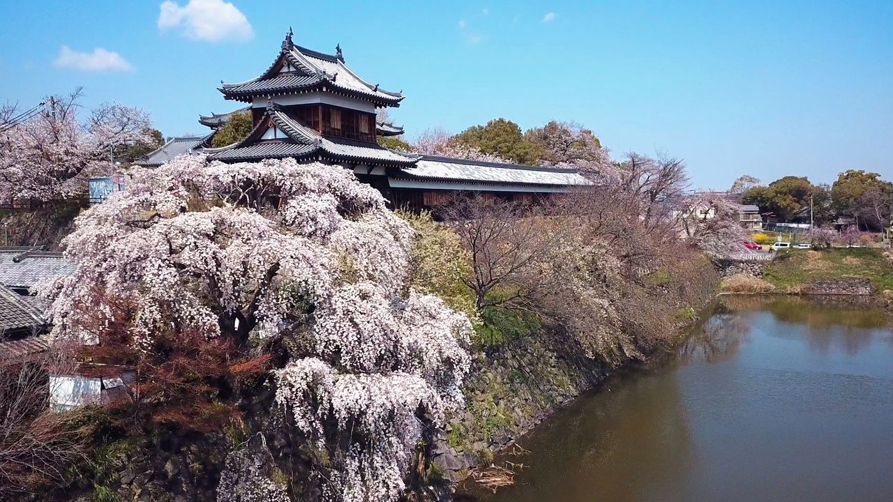 The Kōriyama Castle ruins in the city of Yamatokōriyama, just south of Nara, offer a place to enjoy the spring trees on castle grounds. Built in 1580 by Tsutsui Junkei, who had been a daimyō of the Warring States period (1467–1568), it was formally occupied by Toyotomi Hidenaga, then by the lords of the Kōriyama Clan during the Edo period (1603–1868). The buildings were demolished in the early Meiji era (1868–1912), leaving only the stone wall and the moat of the keep. The Ōtemon gate (also known as the Bairinmon) and two of the castle towers were restored in the 1980s, and a donjon observation facility was opened to the public in 2017. The site is known for the weeping cherry trees that lavishly decorate the towers and the stone wall. There are some 800 cherry trees blooming on the grounds in all, earning the ruins a spot on the list of the top 100 cherry blossom sites in Japan. The annual Yamatokōriyama Castle Festival draws many attendees for such events as a nighttime light show and a historical pageant with warriors in traditional Japanese armor parading around the grounds.
