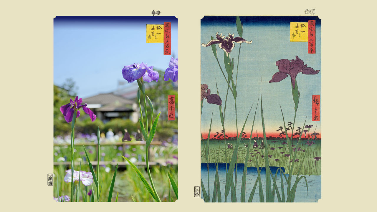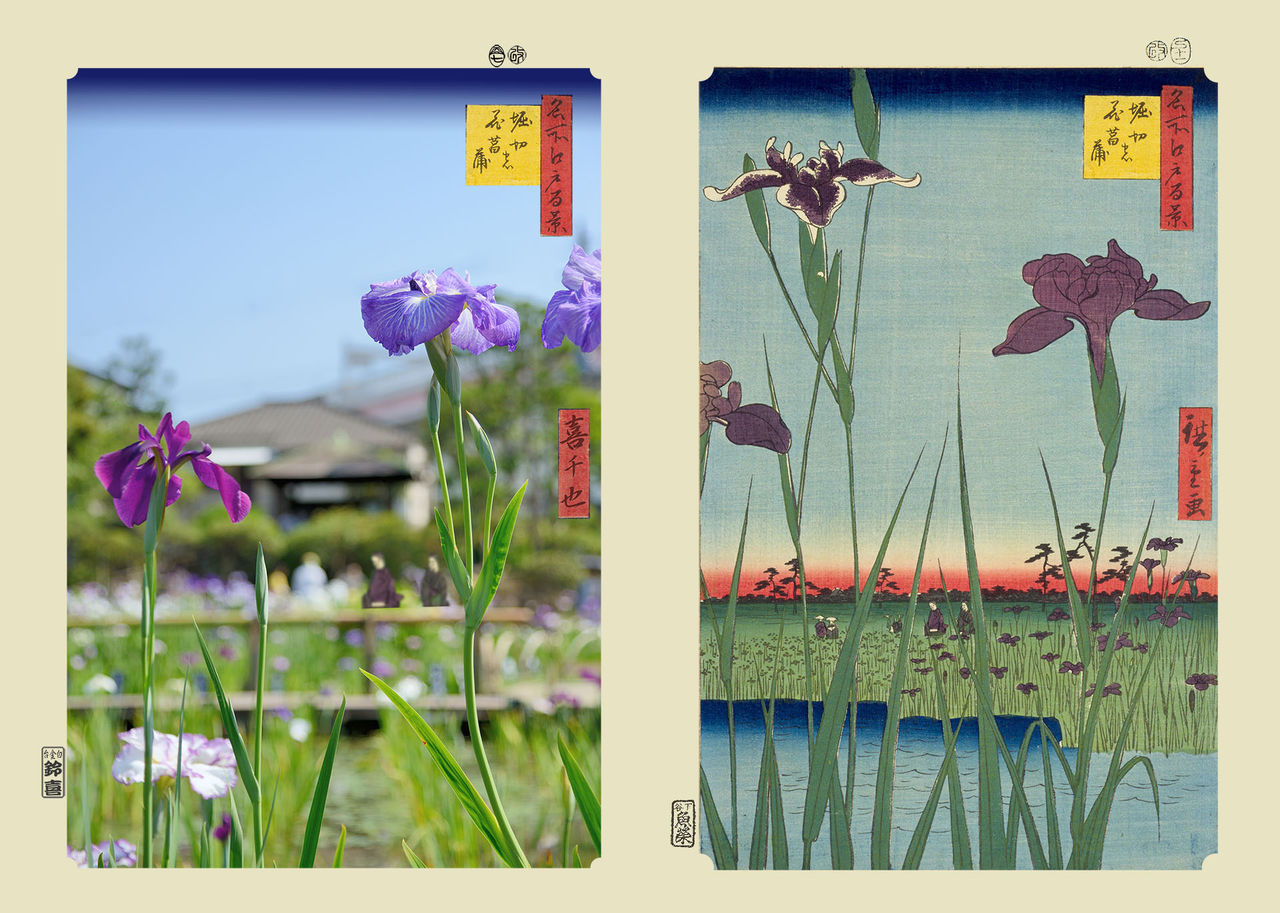 I snapped my photograph recreating the print in 2014, not long after I began this series. These days I prefer to capture more of the scene as it currently exists, but back then I used a wider aperture to blur the background. The iris gardens in Horikiri are smaller than in Hiroshige’s time, but by shooting from a low angle with plenty of sky in the frame I was able to create something reminiscent of the sprawling, open landscape that Hiroshige depicts.
