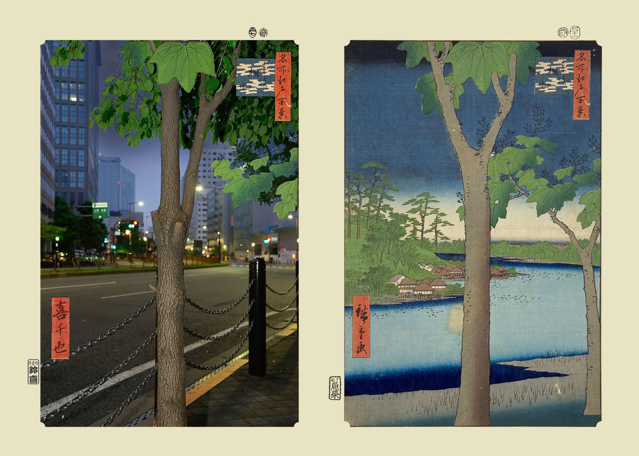 I took my picture early one morning in the rainy season. I managed to find a spot near the Sannōshita intersection where the curve of the road echoed the arc of Tameike Pond in Hiroshige’s print. A roadside tree stood in nicely for his foreground paulownia, so I was at least able to recreate the original composition. Few cars were on the streets so early, which also helped recapture some of the stillness of the scene.