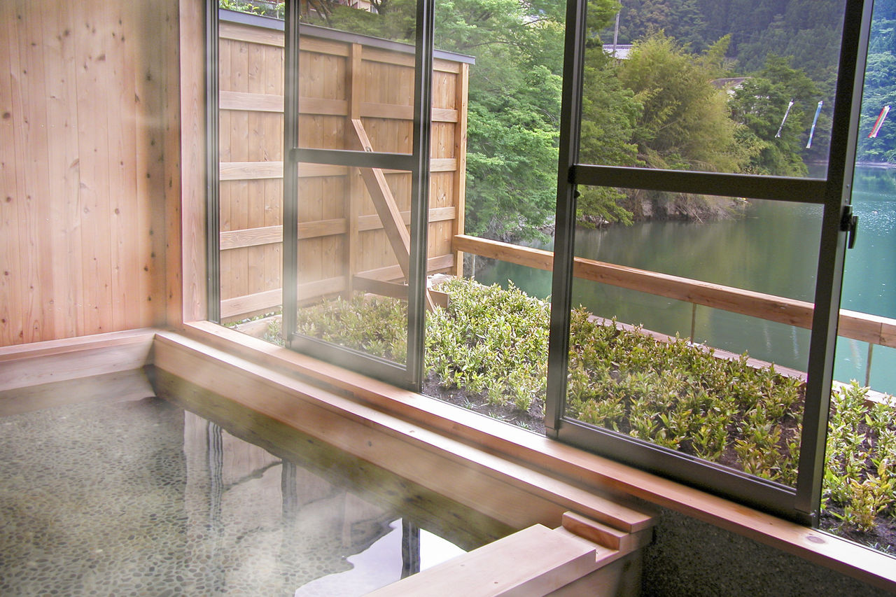 At the Totsukawa hot springs—located along the shores of the Futatsuno Dam reservoir, south from the village office—visitors will find a plethora of ryokan inns and shops. The wellspring, said to have been discovered in the late seventeenth century by a charcoal-maker, is located upstream along the Kamiyu River, a tributary of the Totsukawa. The silky water here is easy on the skin, and it is said to aid those suffering from digestive ailments and diabetics when ingested.